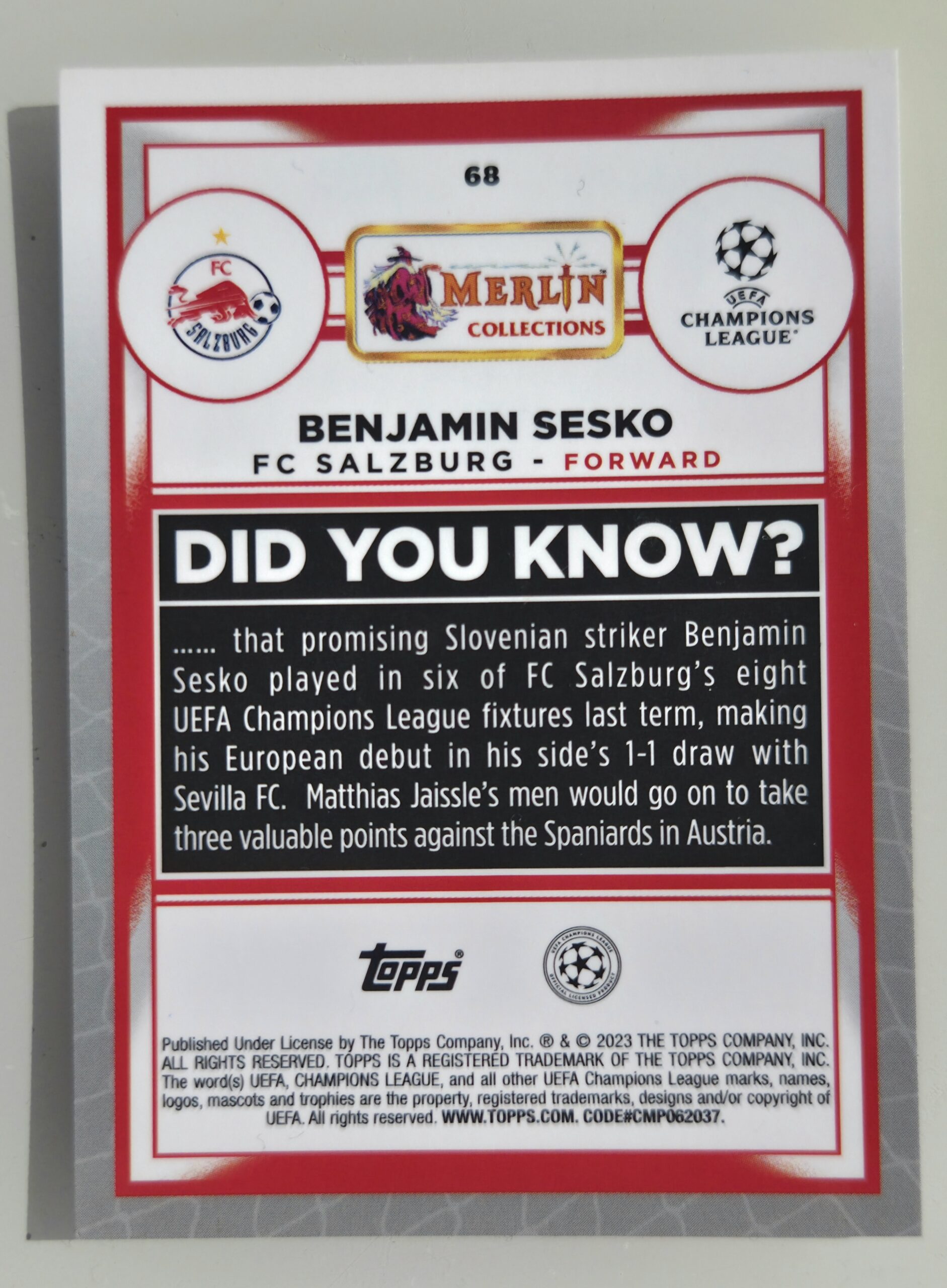 Benjamin Šeško #68 – 2022-23 Topps Merlin UEFA Club Competitions – FC Salzburg
