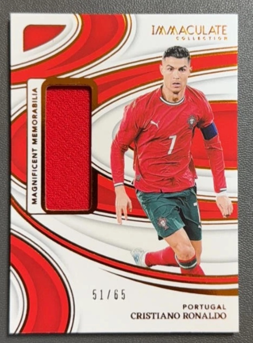 This Magnificent Memorabilia card features an embedded authentic memorabilia swatch and is serial numbered 51/65, making it a limited and highly collectible piece. The elegant Immaculate design highlights Ronaldo in his Portugal national team kit, adding strong visual and collector appeal.