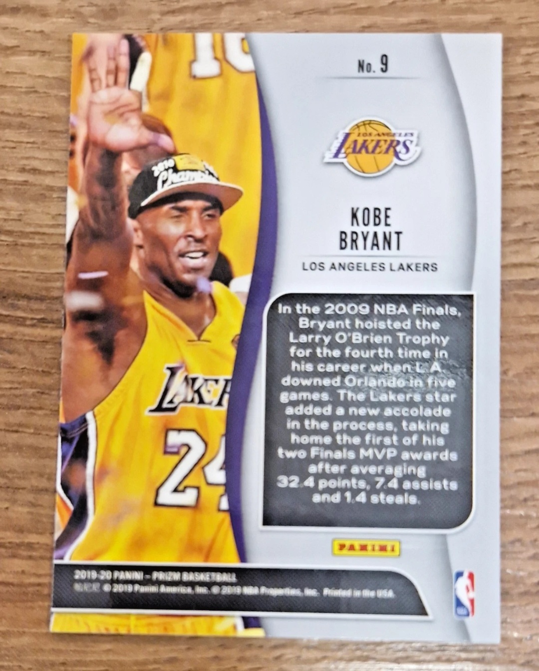Iconic Kobe Bryant NBA card from the Panini Prizm 2019/20 set, featuring a classic championship-era image of a true basketball legend.