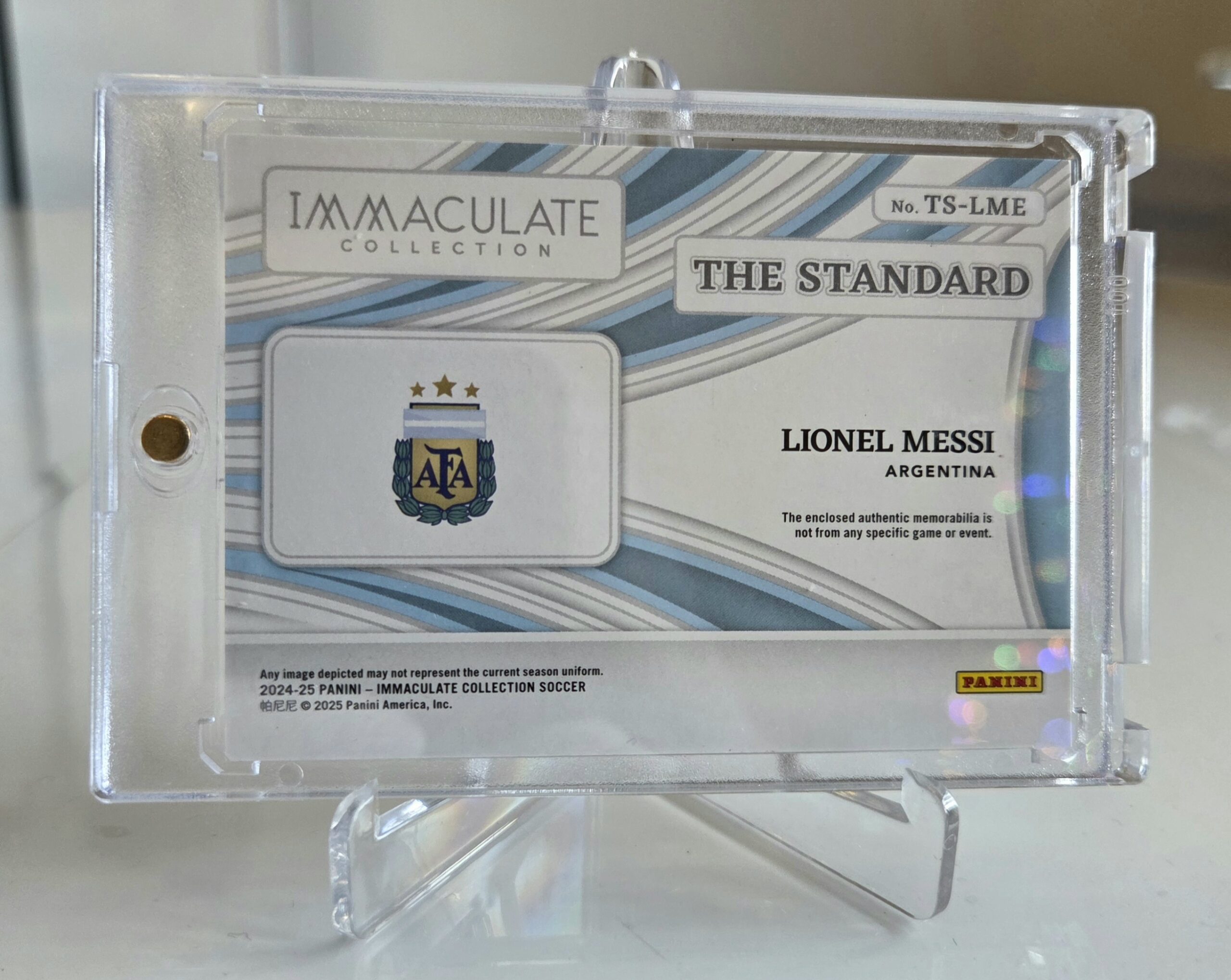 An original Lionel Messi jersey patch memorabilia card from the Panini Immaculate Collection Soccer – The Standard.