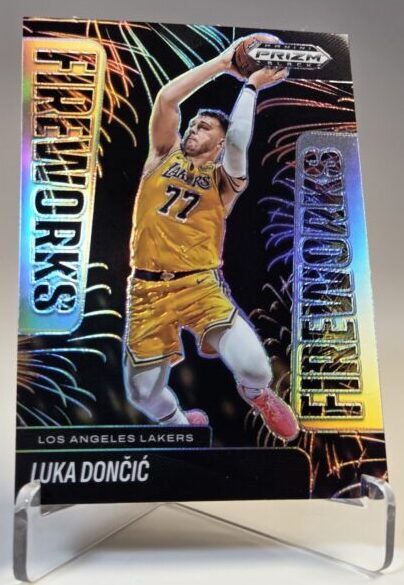 Eye-catching Luka Dončić Fireworks insert from the Panini Prizm Black 2024/25 set, featuring a bold design and strong visual impact. A great collectible for NBA fans and collectors.