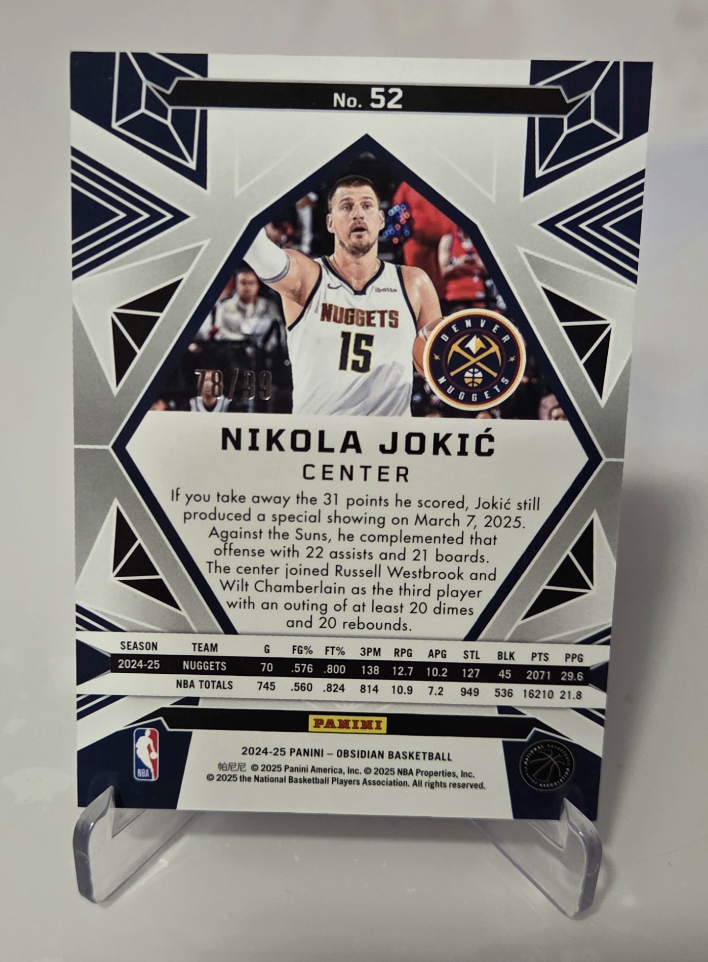 The back of the card includes statistical information and a description highlighting Jokić’s outstanding performance during the 2024/25 season. Nikola Jokić, a multiple-time MVP and one of the greatest centers of all time, remains highly sought after by collectors worldwide.